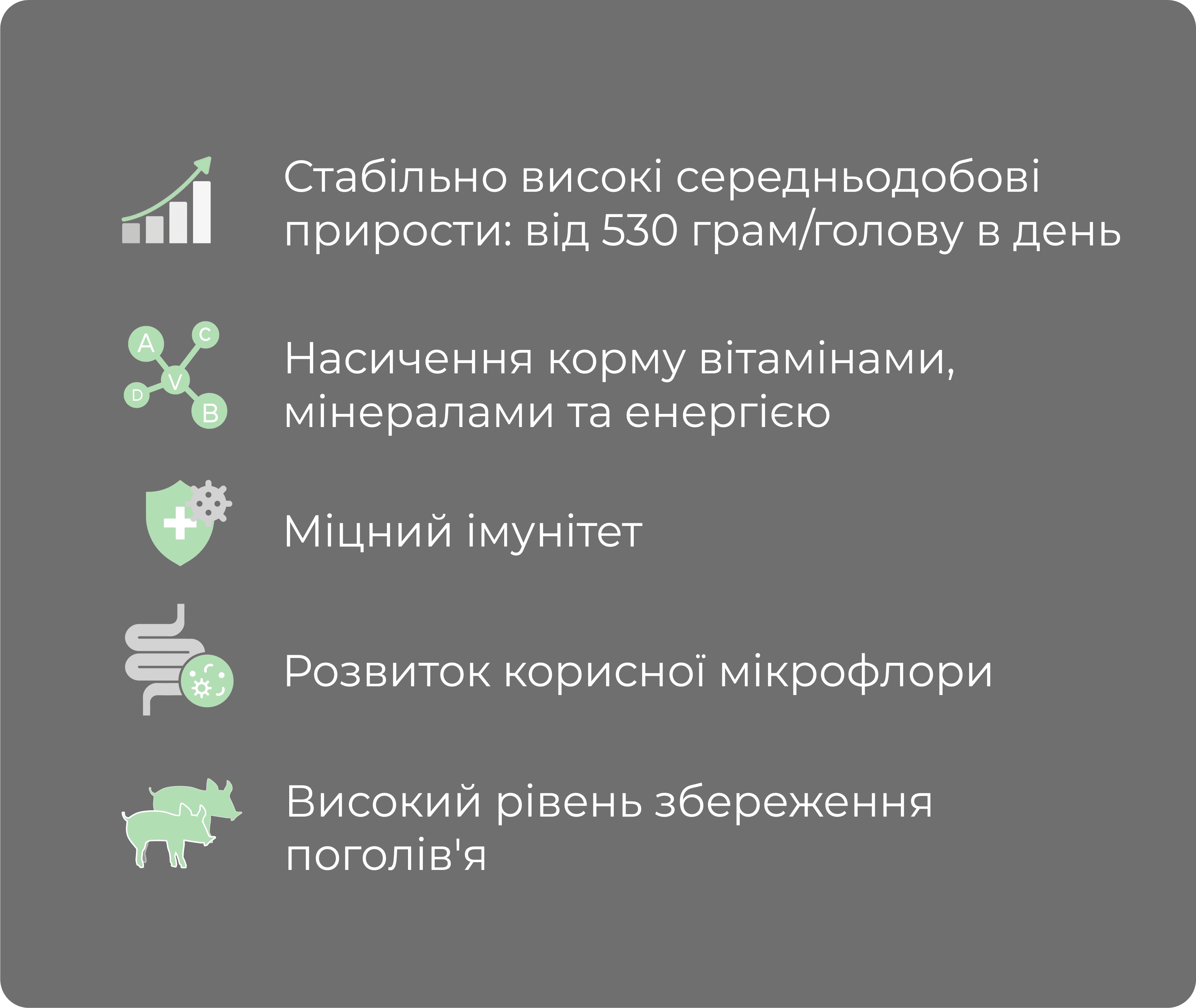 Стабільно високі середньодобові прирости від 530 грам/голову в день як результат високої засвоюваності та рівня поїдання корму.