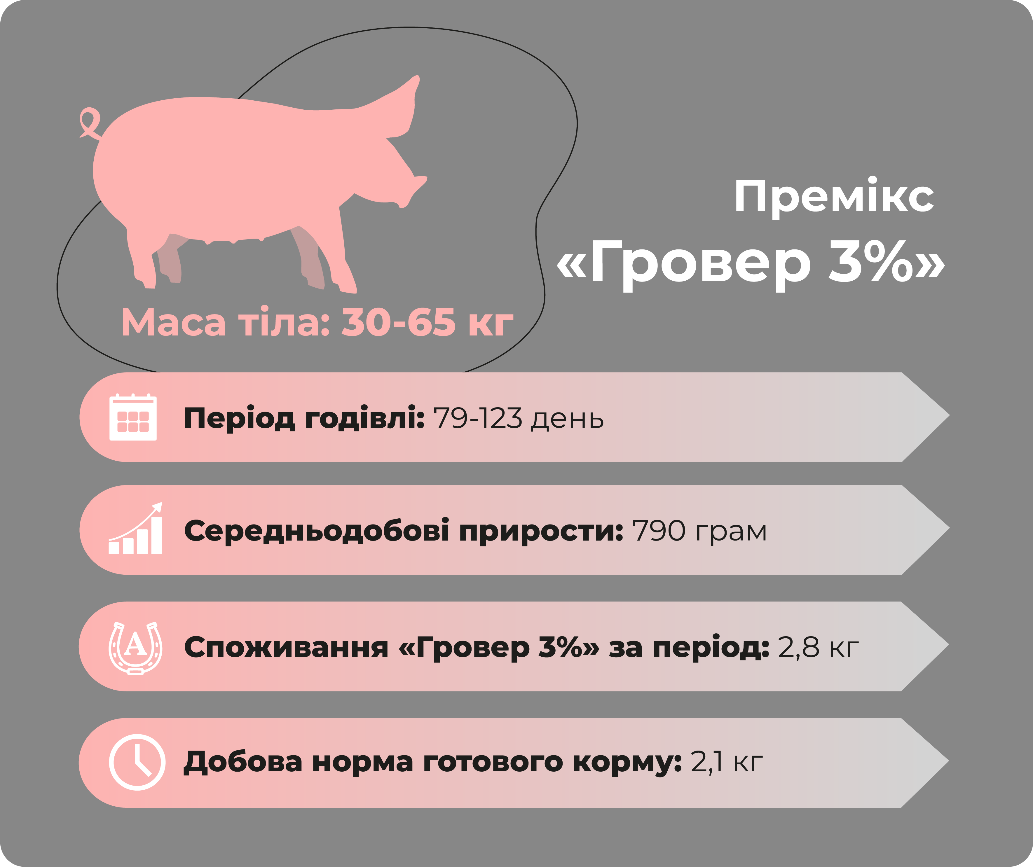 Премікс для свиней «Гровер 3%» забезпечить стабільно високі середньодобові прирости від 790 грам, здоровий ріст і розвиток м’язів свиней в гроверний період (від 30 до 65 кг) за 44 дні.