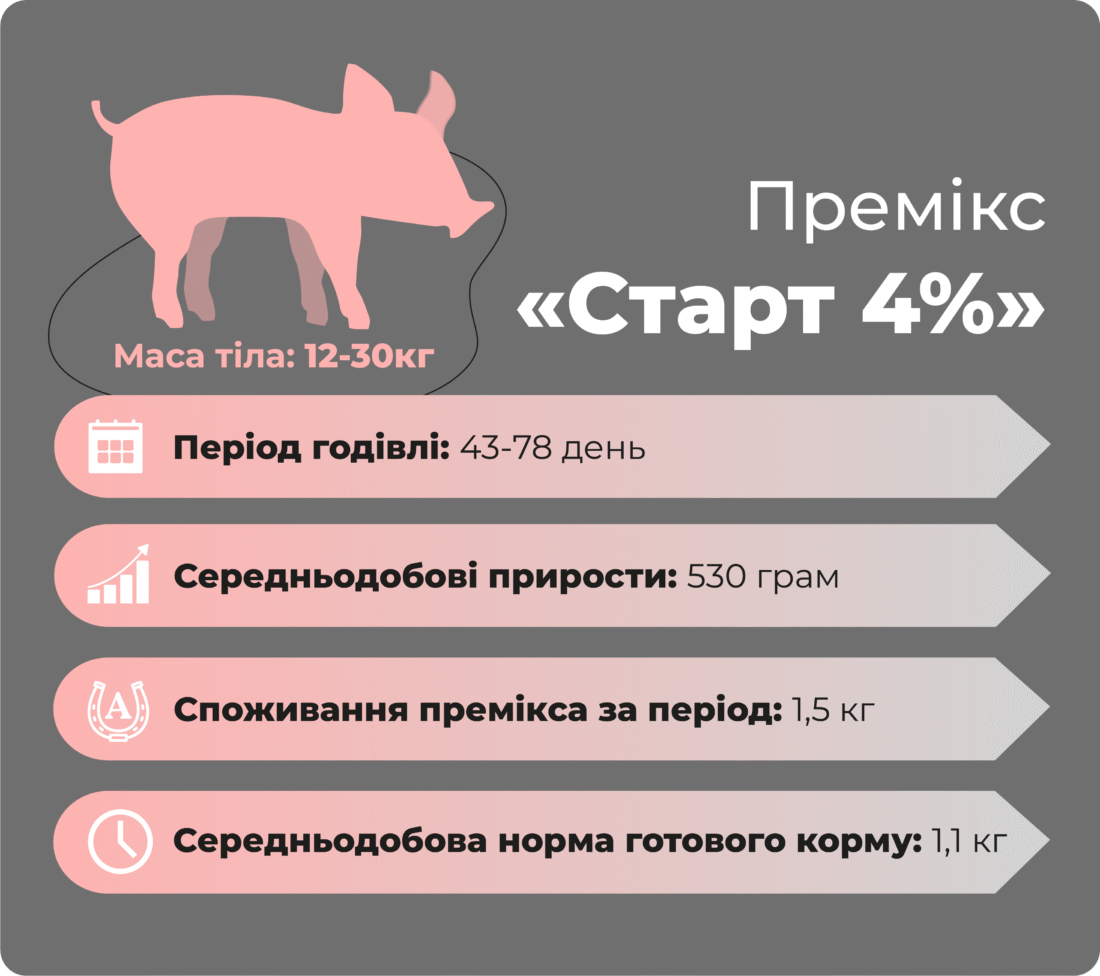 Премікс «Старт 4%» забезпечує збалансоване харчування, сприяючи здоровому росту та розвитку.