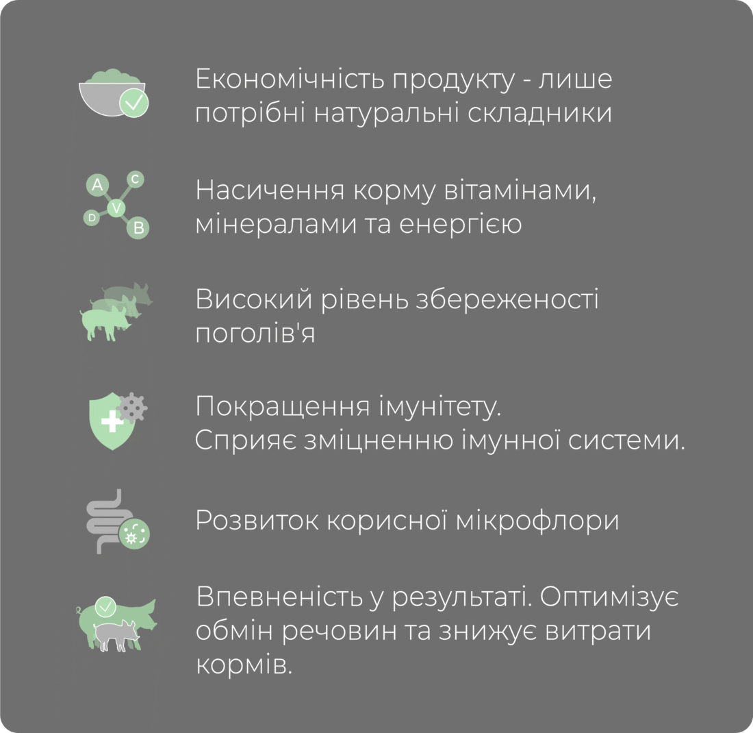 Оптимізує обмін речовин та знижує витрати кормів, враховуючи потреби тварин в стартовий період.