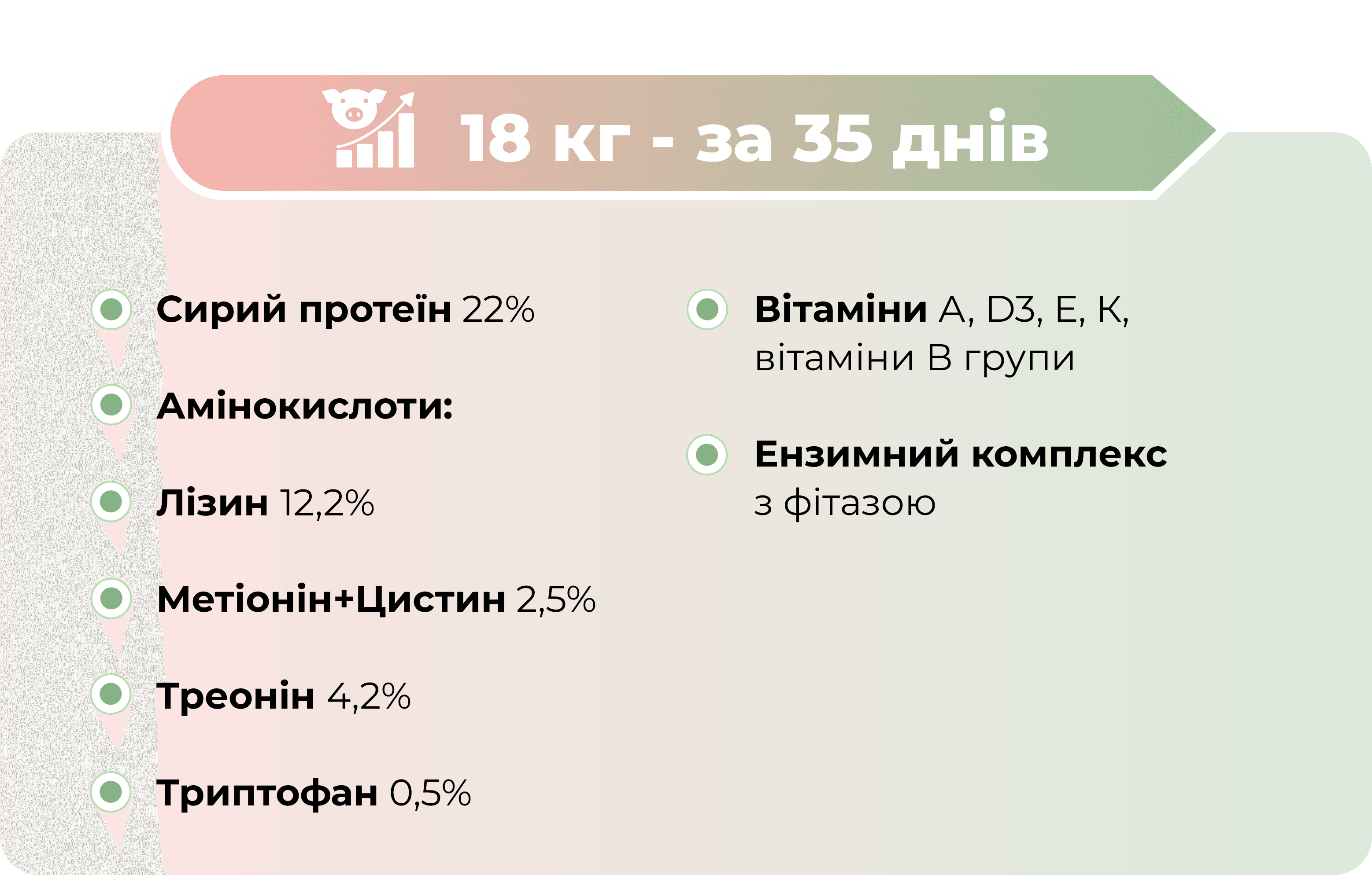 Забезпечує збалансоване харчування, сприяючи здоровому росту та розвитку поросят від 12 до 30 кг за 35 днів.